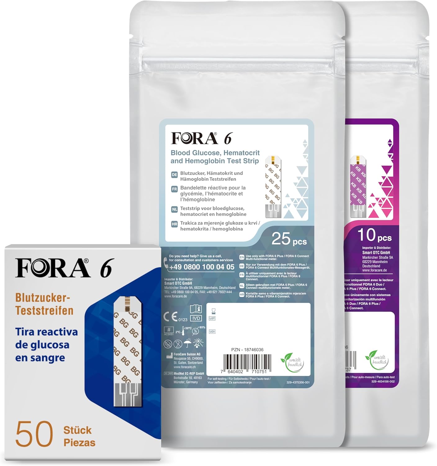 Mit den Fora Teststreifen für das Fora 6 Messgerät messen Sie Ihre Gesundheitswerte einfach und schnell. Wählen Sie aus vier Varianten: Blutzucker, Totalcholesterin, Harnsäure oder 3-in-1 (Blutzucker, Hämatokrit, Hämoglobin). Zuverlässige Ergebnisse in Sekunden. Packung mit [Anzahl] Streifen. Hinweis: Zur Selbstmessung, ersetzt keine ärztliche Diagnose – bitte Gebrauchsanweisung beachten und bei Bedarf einen Arzt konsultieren.
