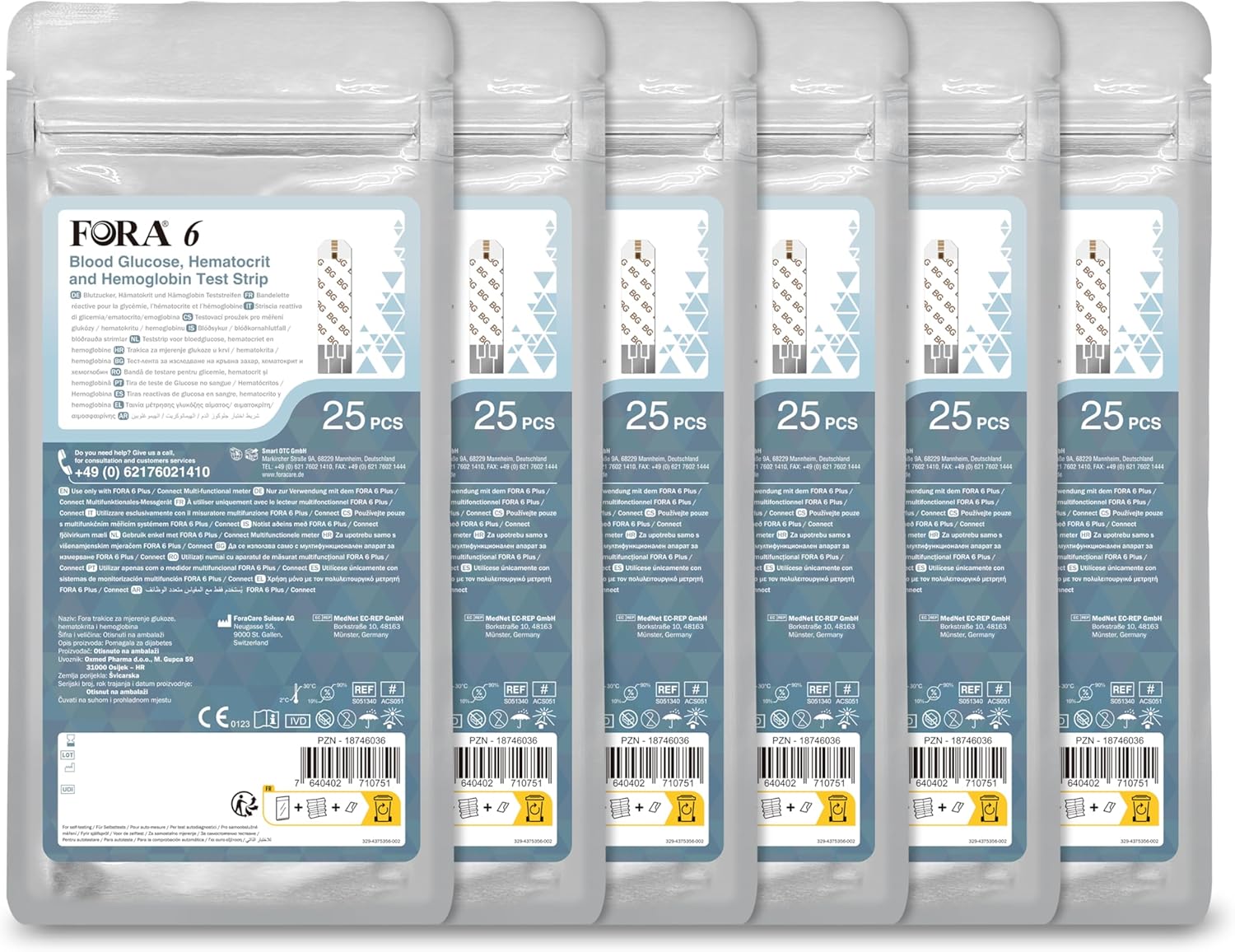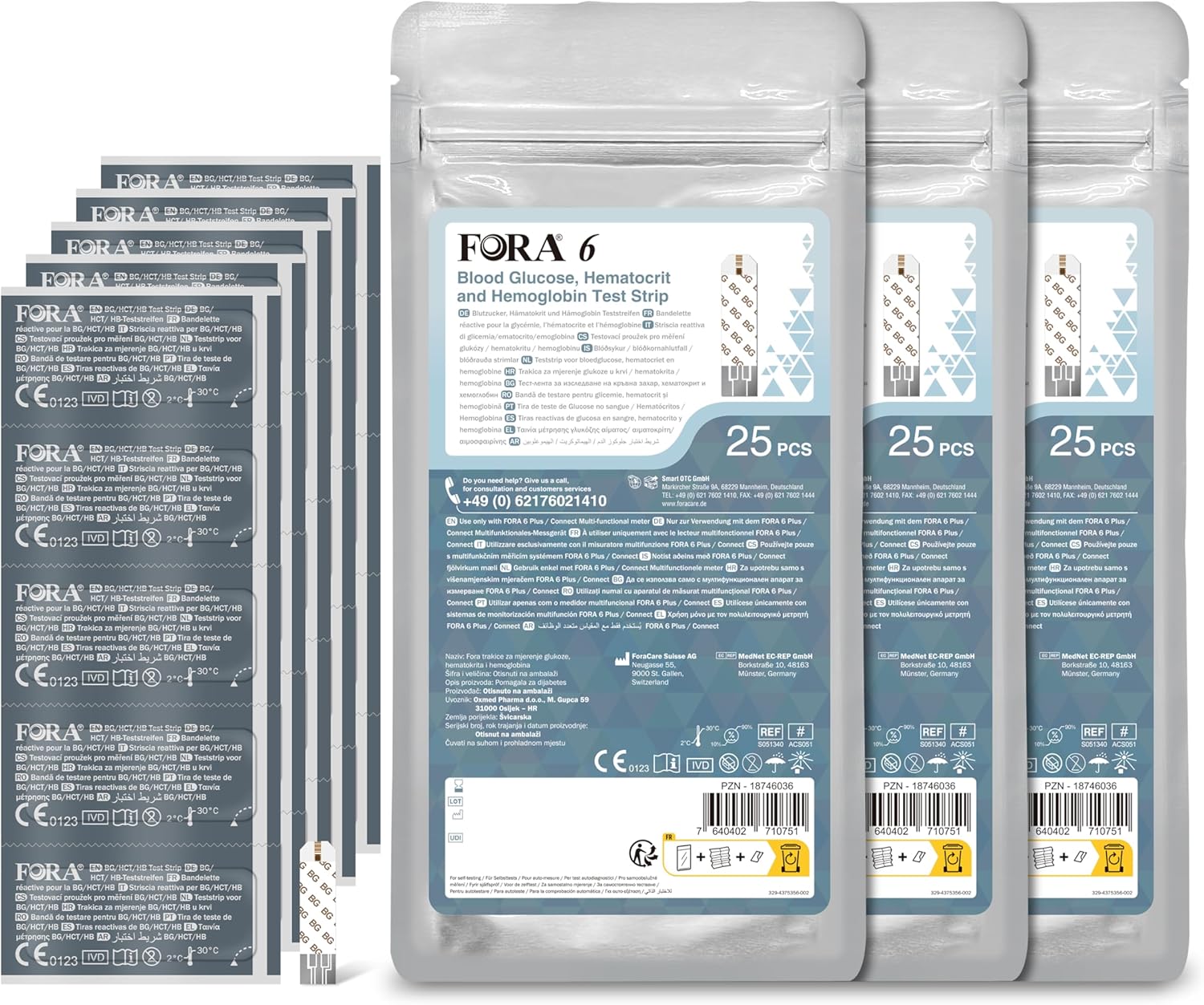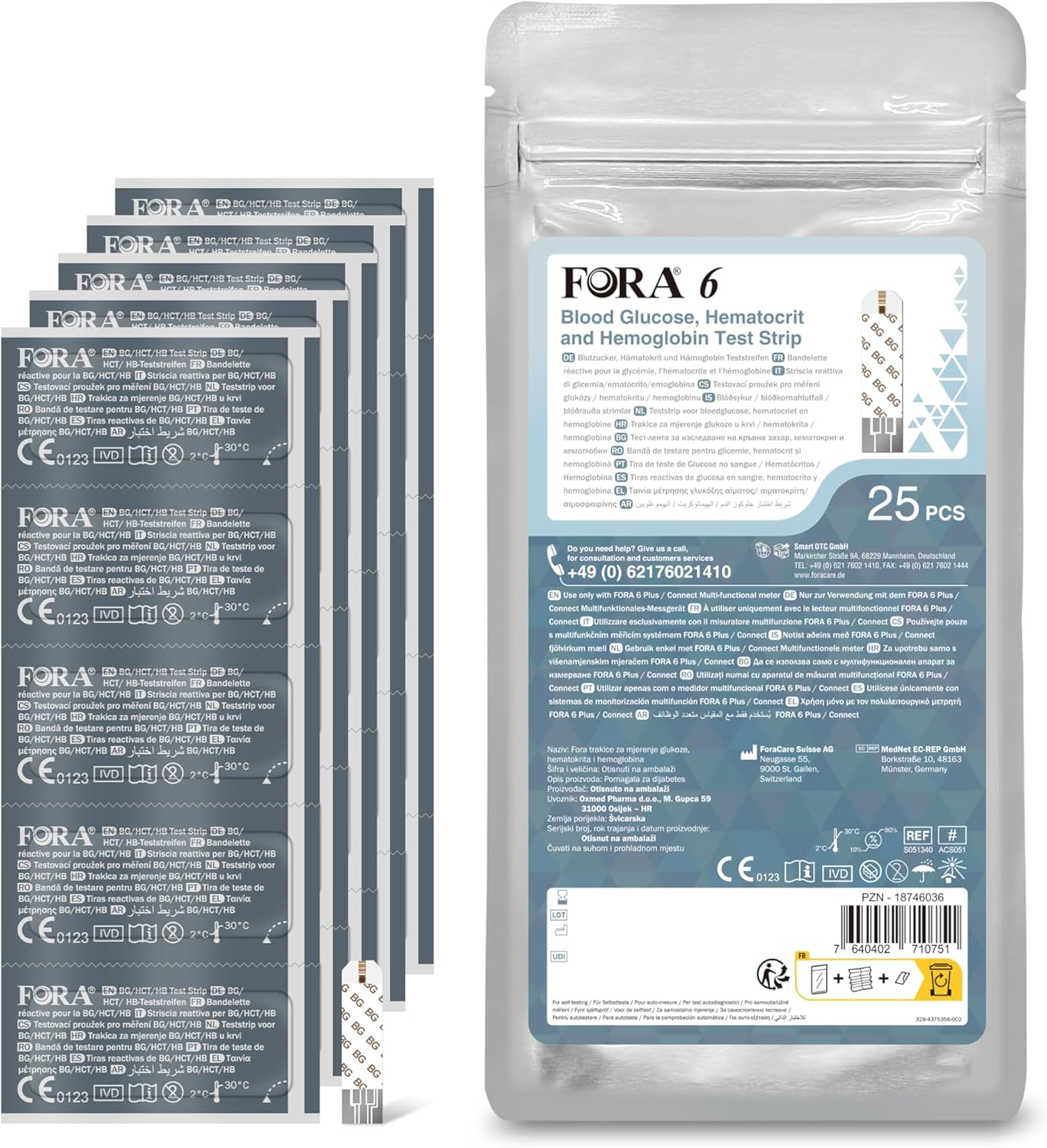Mit den Fora Teststreifen für das Fora 6 Messgerät messen Sie Ihre Gesundheitswerte einfach und schnell. Wählen Sie aus vier Varianten: Blutzucker, Totalcholesterin, Harnsäure oder 3-in-1 (Blutzucker, Hämatokrit, Hämoglobin). Zuverlässige Ergebnisse in Sekunden. Packung mit [Anzahl] Streifen. Hinweis: Zur Selbstmessung, ersetzt keine ärztliche Diagnose – bitte Gebrauchsanweisung beachten und bei Bedarf einen Arzt konsultieren.